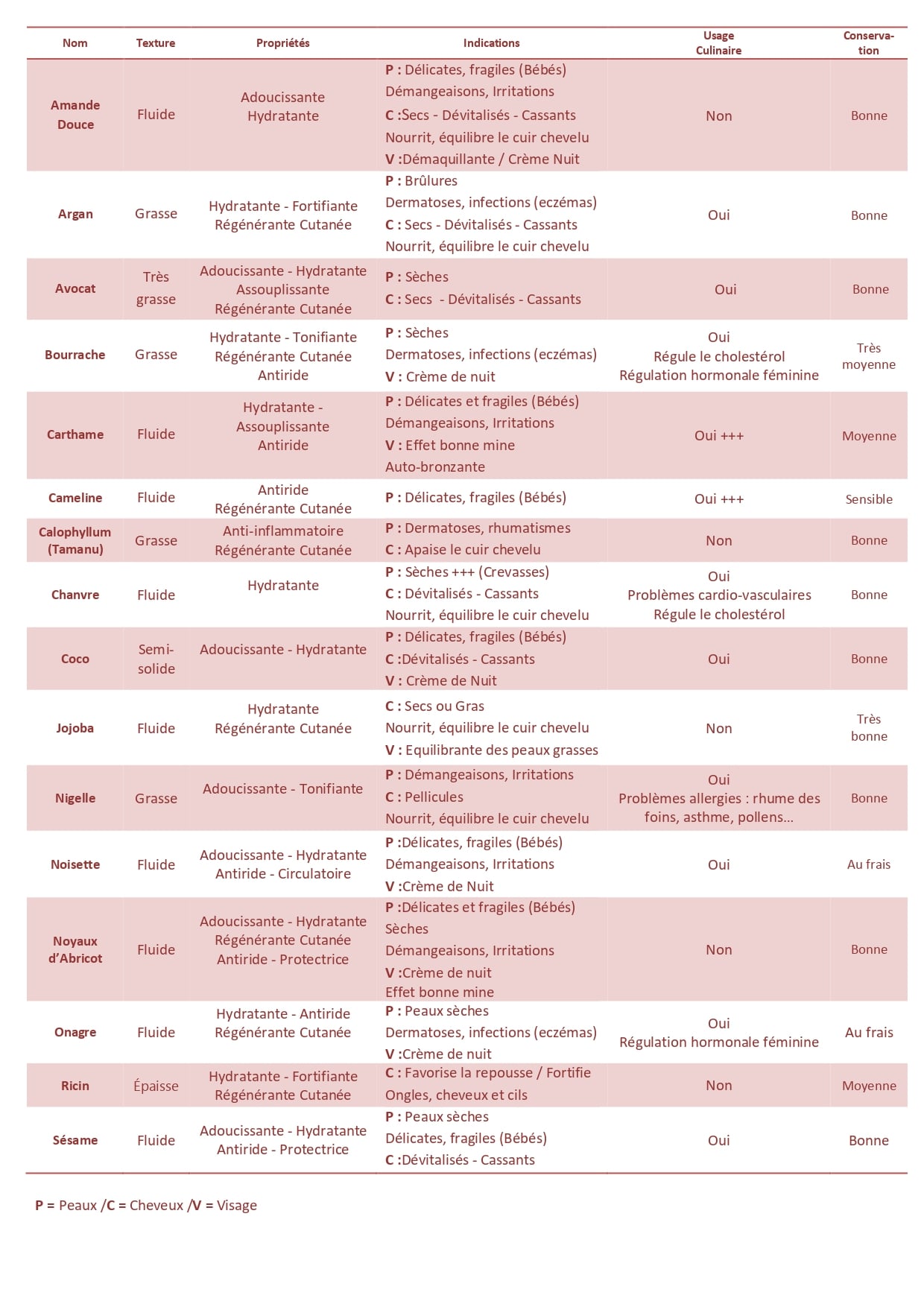 A but thérapeutique, elles sont couramment utilisées mais sachez que vous. Pouvez aisément utiliser vos huiles végétales pour un geste beauté (voir tableau).