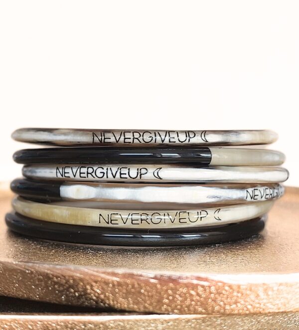 ** Gravure noire ** Taille unique: Diametre entre 63 et 65 mm ** Coloris de corne aléatoire ** Fait à la main à partir de cornes upcyclées *** 1 jour / 1 bracelet / 1 message…. *** 7 bracelets = 7 messages *** A porter seul ou associés à nos JolisJoncs bouddhistes.