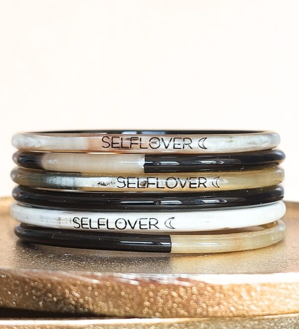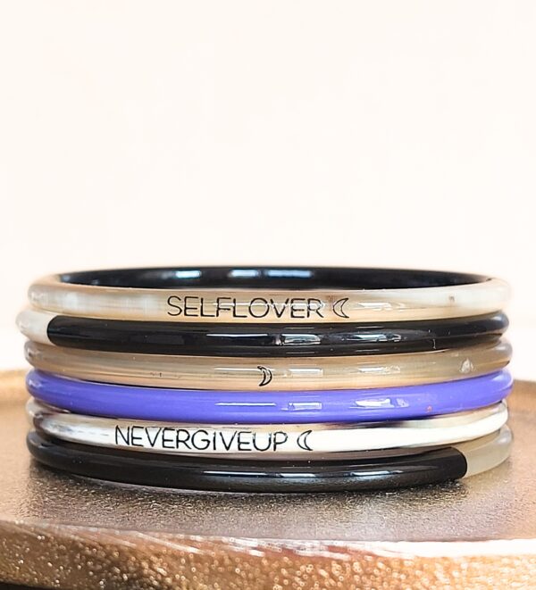 ** Gravure noire ** Taille unique: Diametre entre 63 et 65 mm ** Coloris de corne aléatoire ** Fait à la main à partir de cornes upcyclées *** 1 jour / 1 bracelet / 1 message…. *** 7 bracelets = 7 messages *** A porter seul ou associés à nos JolisJoncs bouddhistes.