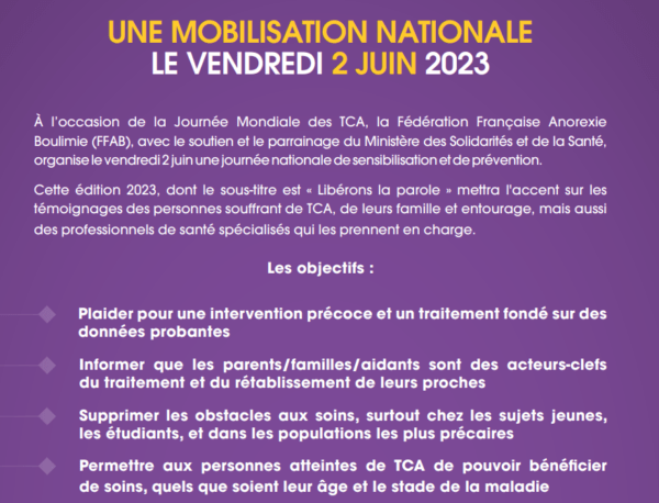 A l’occasion de la 8e Journée internationale des TCA, la Fédération Française Anorexie Boulimie (FFAB) organise, le 2 juin 2023, la 3e journée de sensibilisation aux TCA à l’échelle nationale. Partout en France : des conférences, des webinars, des témoignages, des instalives, des animations et de nombreux événements pour relayer l’information sur l’anorexie mentale, la boulimie et l’hyperphagie boulimique.