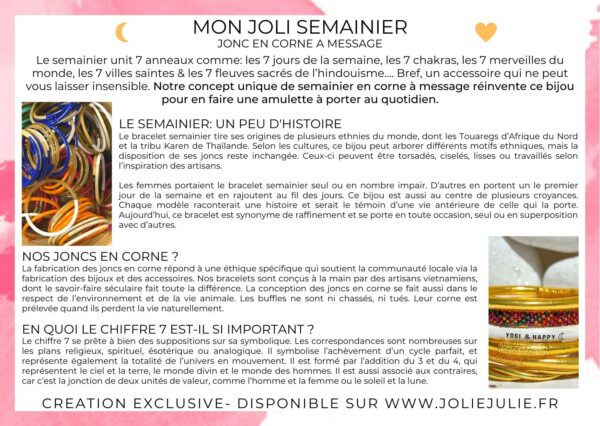 • 1- Echange de taille: uniquement sur les Joncs bouddhistes/semainier En nous les renvoyant en l’état à vos frais, l’échange est lui gratuit. A renvoyer à : Julie Chalayer – 7 ZA de la Platière 42320 La Grand Croix Indiquer num de commande + taille souhaitée..