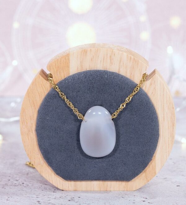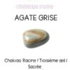 L’agate grise est une pierre de la famille du quartz, et disposant d’un grand pouvoir de relaxation, de protection et d’ancrage. Elle attire les énergies positives, et entraîne la bonne humeur constante. Elle possède une couleur grise brillante, ornée par des bandelettes blanches.