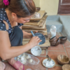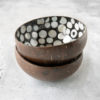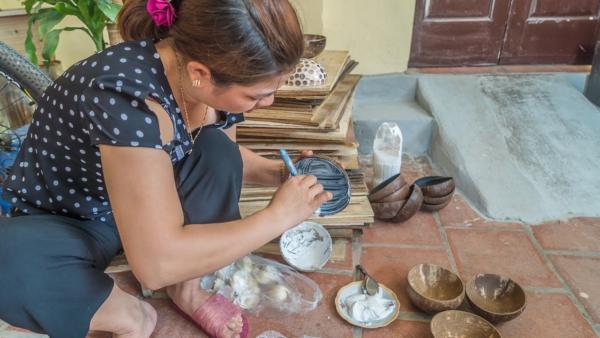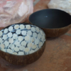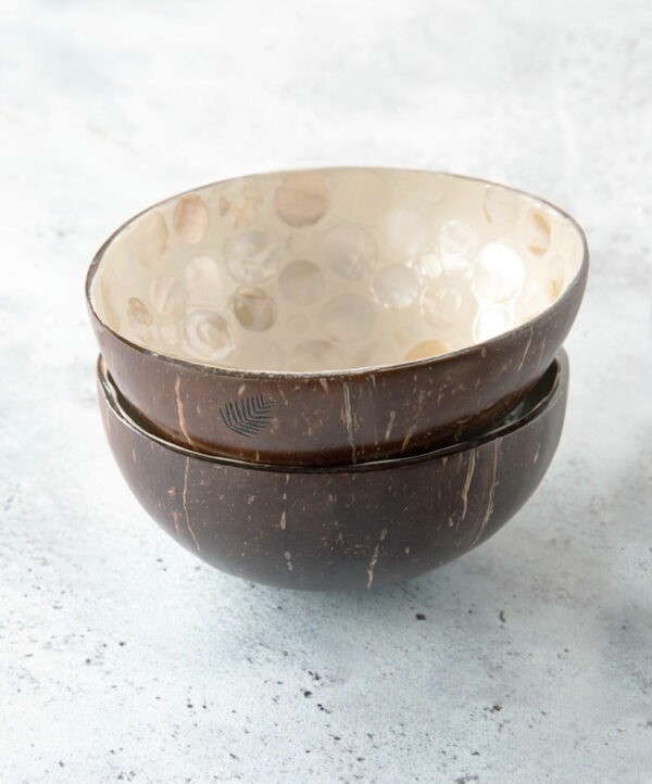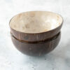 Ce bol fabriqué à partir d’une coque de noix de coco recyclée est décoré à la main.