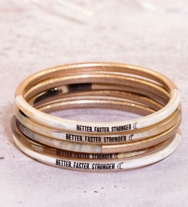 ** Gravure noire Better, faster, stronger ** Taille unique: Diametre entre 63 et 65 mm ** Coloris de corne aléatoire (cest ce qui les rends uniques) ** Fait à la main à partir de cornes upcyclées *** 1 jour / 1 bracelet / 1 message…. *** 7 bracelets = 7 messages *** A porter seul ou associés à nos JolisJoncs bouddhistes.