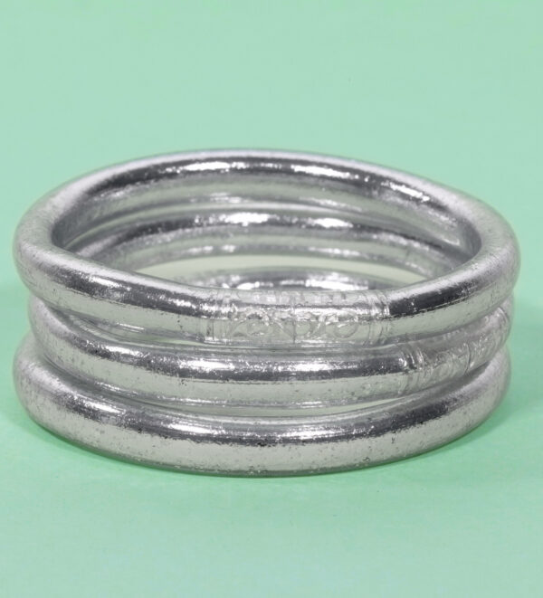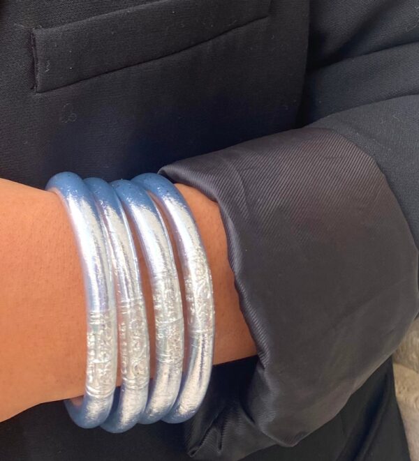 Coloris:Jonc souple en plastique transparent rempli de fines feuilles de métal. Fermé par un connecteur orné d’arabesques et du mantra LUCK.
