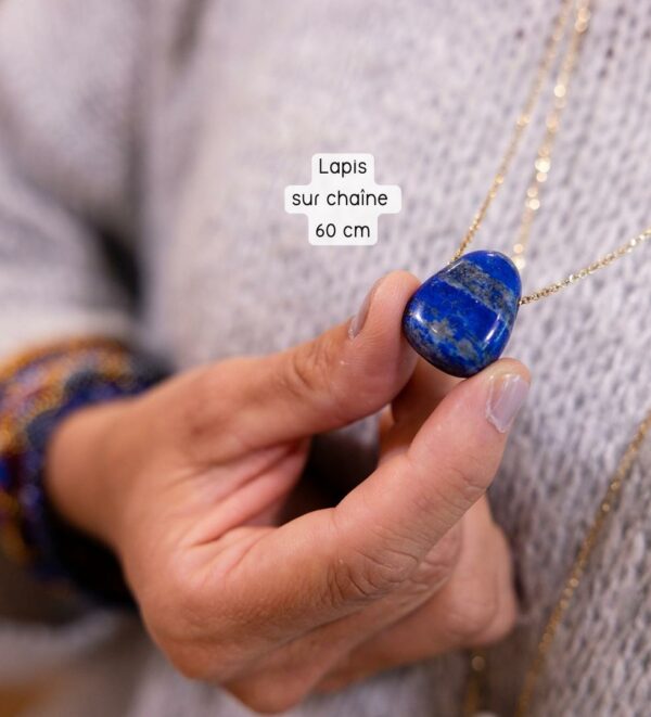 Pierre percée Lapis Lazuli , forme goutte – S election “ MonCollierlitho “. > Mots clefs: Propriétés apaisantes/ Dépassement des peurs / Soulage maux de tête