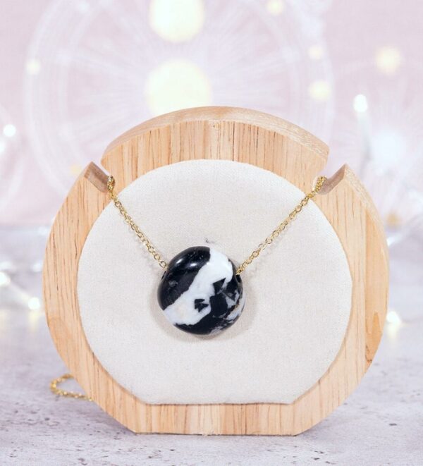 Pierre percée marbre zèbre forme goutte – Selection “MonCollierlitho“. > Mots clefs: Stabilise elles énergies du Ying et Yang / Revitalise les zones du corps fatiguées / Apaise les allergies